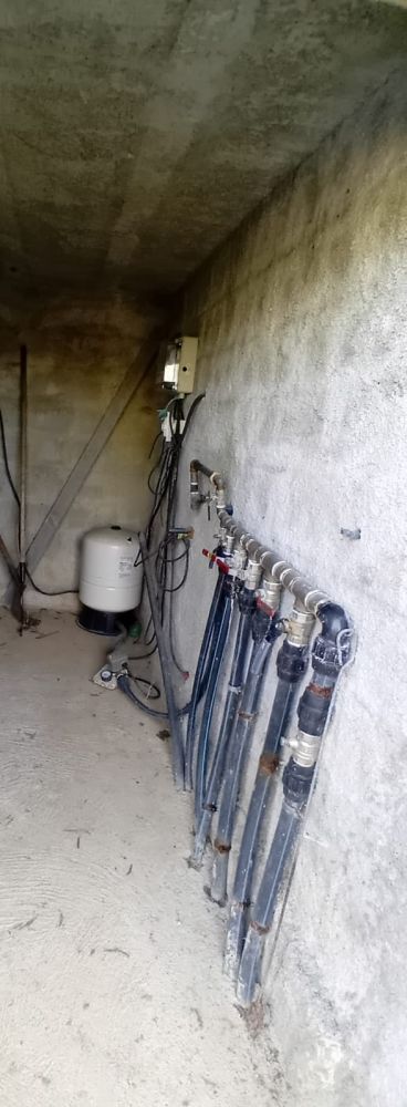 * Um poço furado a pedra com 12 metros com mina. A água do furo está ligada aos tanques. O furo tem profundidade de 120metros e tira a água com uma bomba a 110m2. Tem água canalizada. E tem já 2 torneiras principais para regar os patamares das oliveiras e abastecer a casa principal.